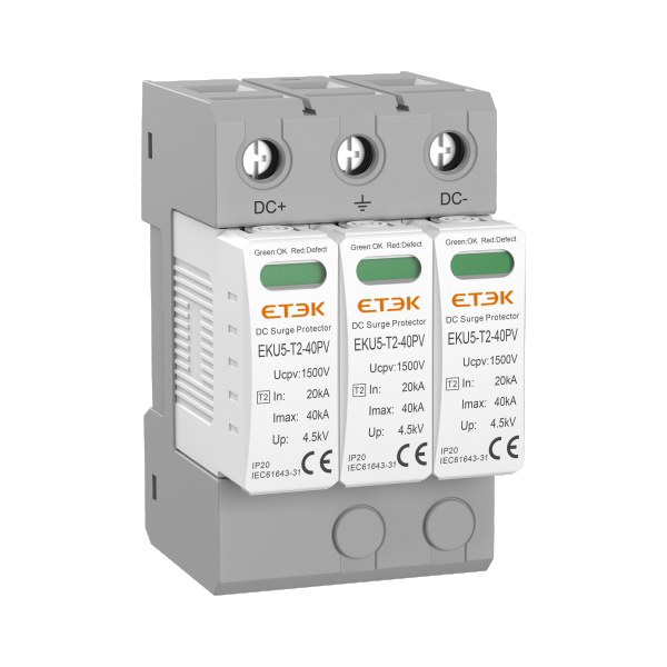 EKU5-T2直流電涌保護器適用于額定電壓DC600?1500V太陽能光伏發(fā)電系統(tǒng)或其他直流電源系統(tǒng)的防雷及過電壓保護。滿足II類(8/20μs波形)電涌保護器(SPD)試驗,用于抑制瞬態(tài)過電壓低于設備耐沖擊過電壓,泄放電涌能量,從而保護系統(tǒng)電路及設備,針對光伏系統(tǒng)設備保護設計U、Y型結構。